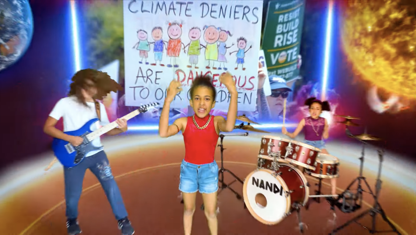 Nandi Bushell, the 11-year-old drumming virtuoso, teamed up with 10-year-old guitarist Roman Morello (son of Tom), for a raucous anthem they co-wrote together about saving the planet before “it’s too late,” as Bushell sings.